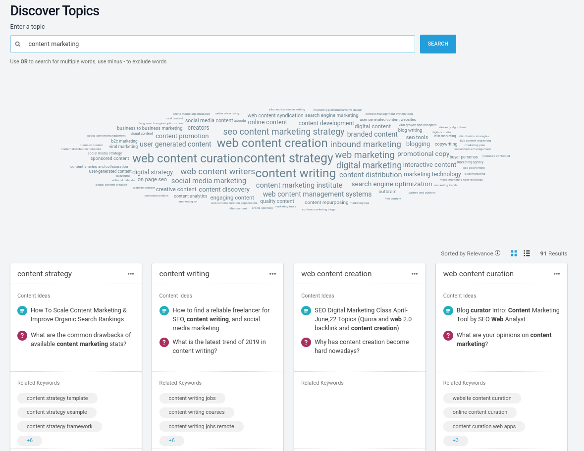 Se você está pronto para começar seus esforços de marketing de conteúdo, mas não sabe em que focar, a ferramenta Discover Topics é um ótimo lugar para começar. Digite qualquer palavra-chave ampla e o BuzzSumo fornecerá uma nuvem de palavras com os tópicos mais populares sobre ela: