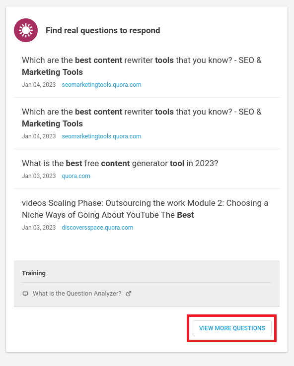 Clicar na guia de perguntas apresenta o analisador de perguntas, onde você encontrará um detalhamento de perguntas genuínas geradas pelo usuário: