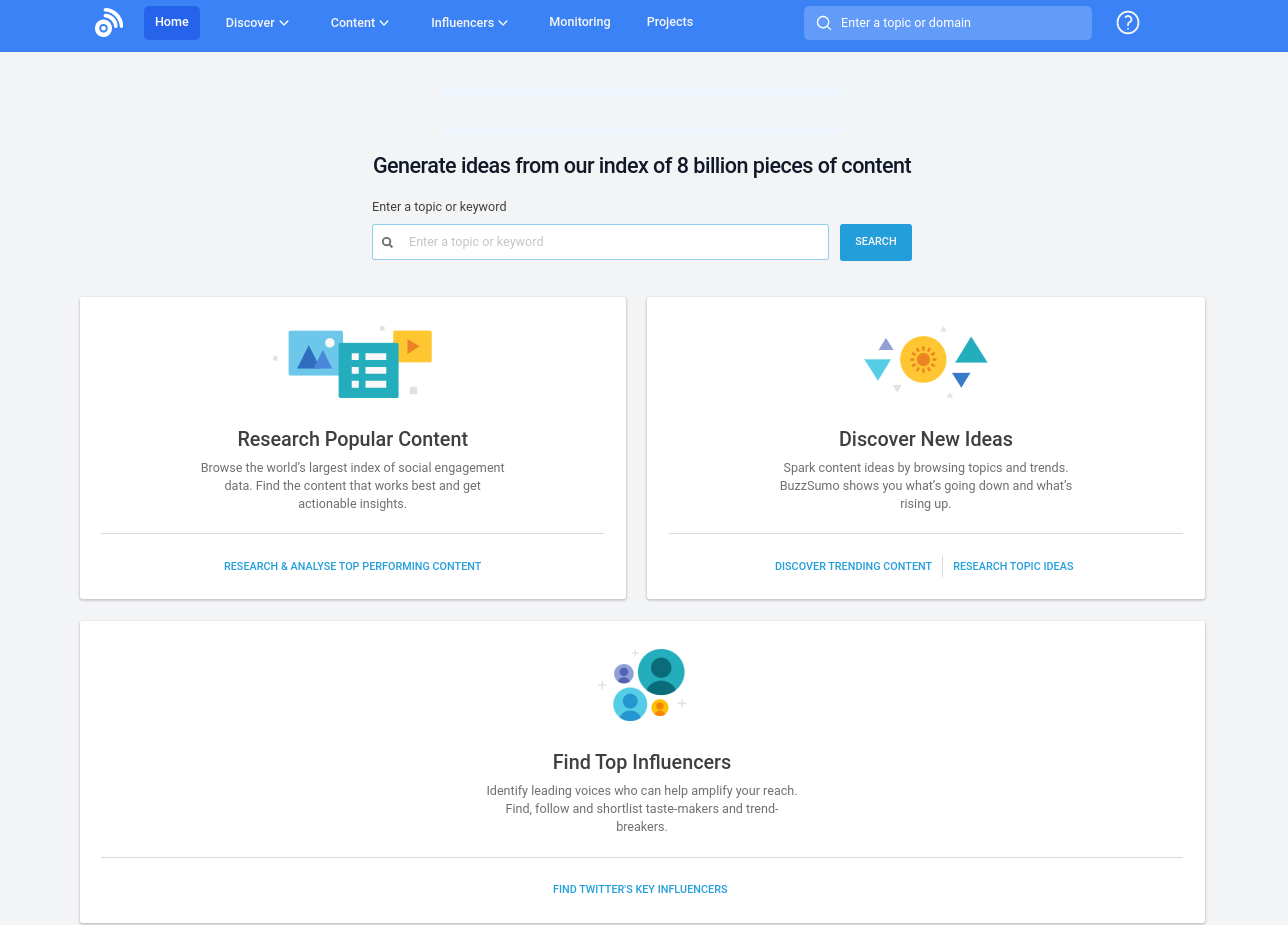 O BuzzSumo divide seus recursos em três categorias principais: Geração de Ideias, Pesquisa de Conteúdo e Descoberta de Influenciadores.