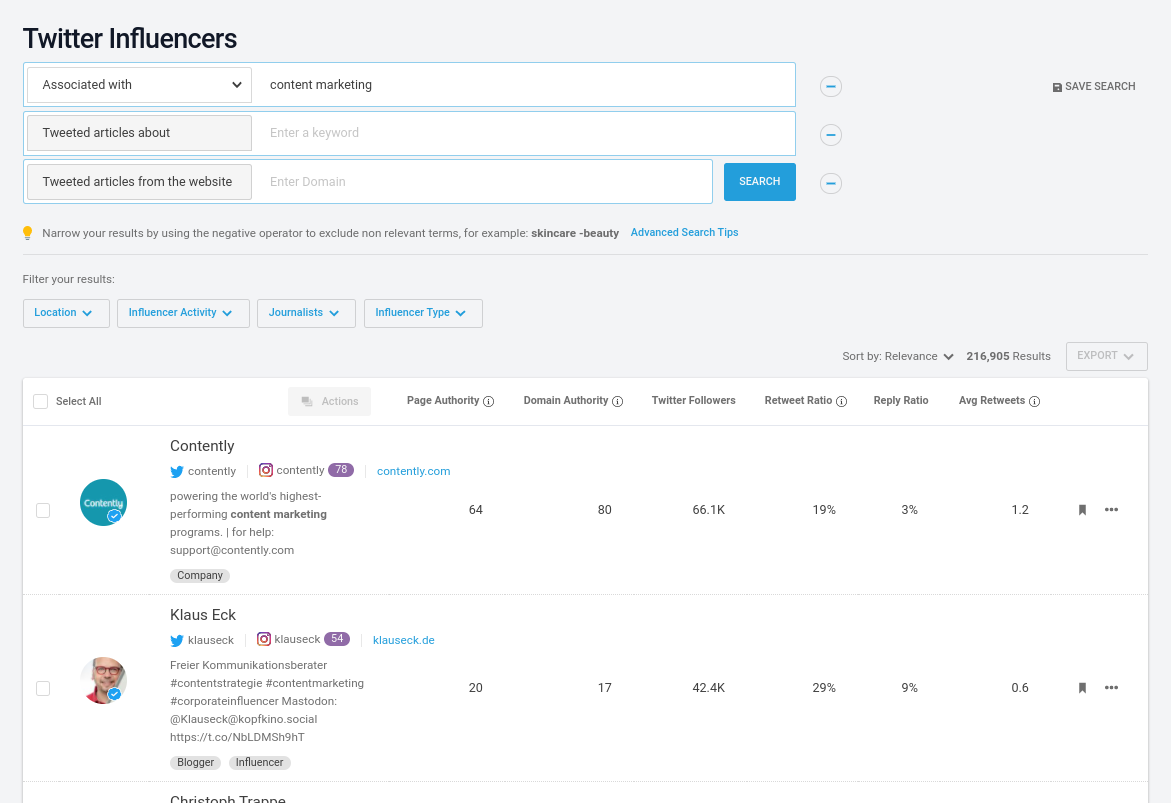 Embora o Gerador de ideias de conteúdo possa ter sido um destaque pessoal para mim, não há como negar que as ferramentas de marketing de influenciadores do BuzzSumo são as verdadeiras estrelas do show aqui. Isso ajuda você a encontrar influenciadores em seu nicho com os quais você pode fazer parceria.