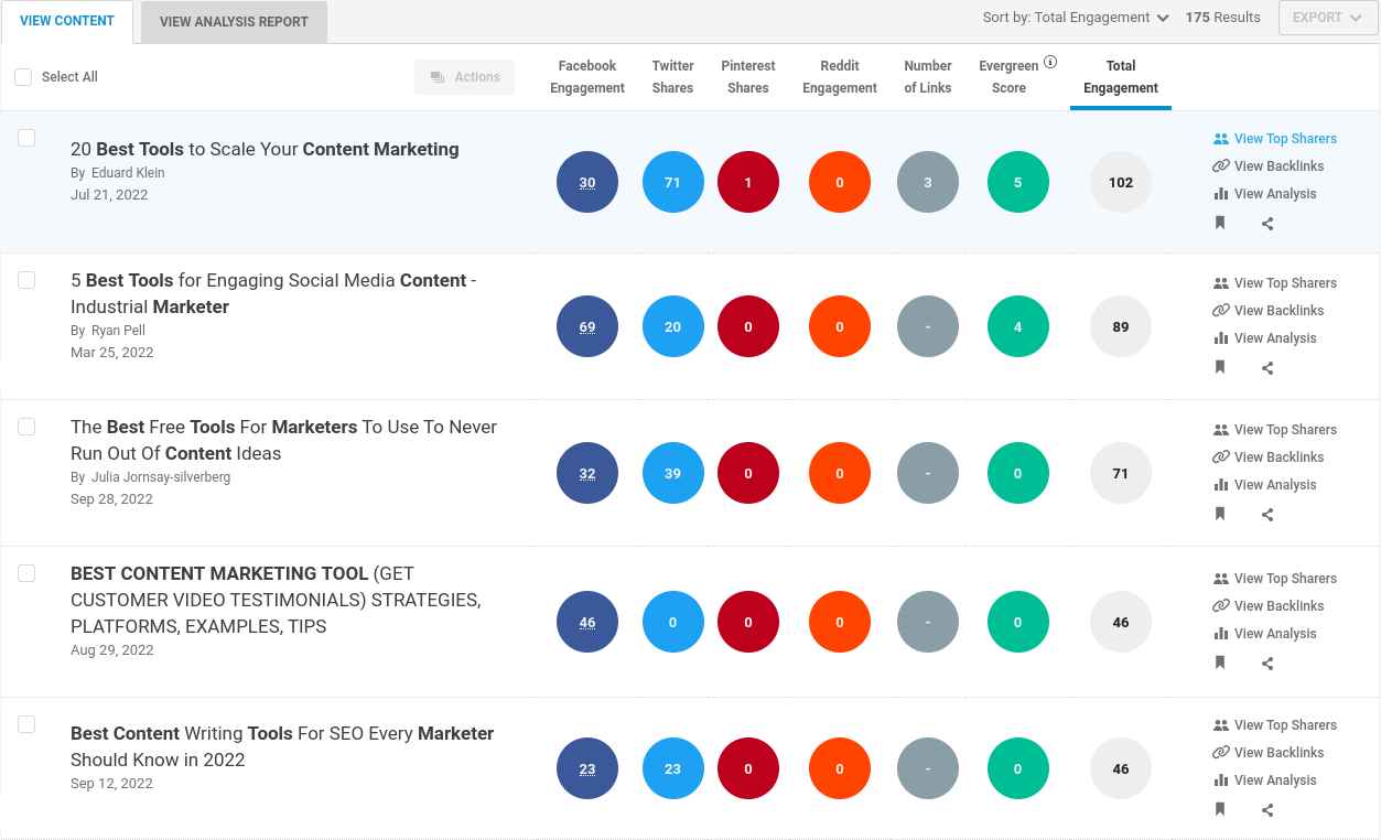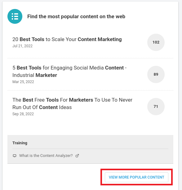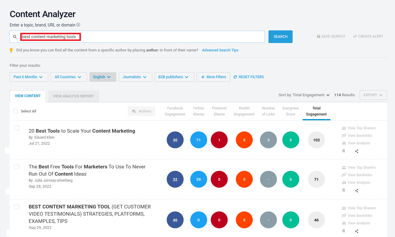 Isso levará você ao painel do Content Analyzer , que exibirá um número selecionado de artigos que geram mais engajamento para a palavra-chave escolhida: