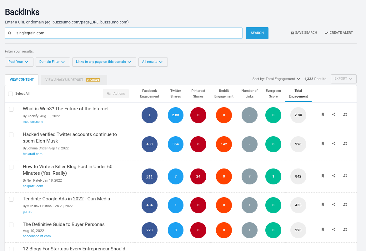 Agora que você tem uma conta, terá acesso a muito mais resultados e poderá visualizar os backlinks e os principais compartilhadores. Você também pode visualizar análises de partes de conteúdo individuais e a própria palavra-chave: