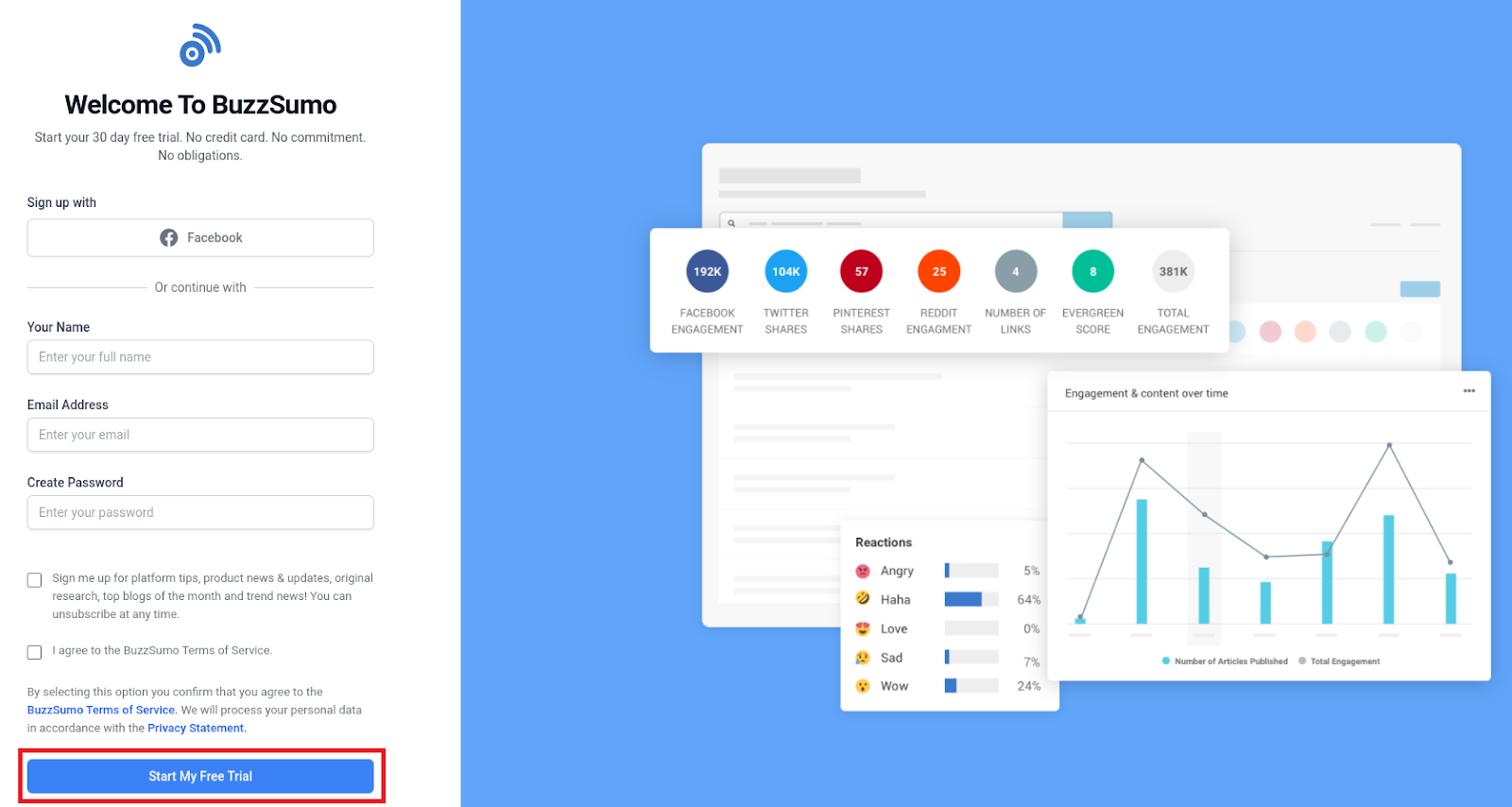 O que eu amo no teste gratuito de 30 dias do BuzzSumo é que você não precisa de um cartão de crédito para acessá-lo. (Todos nós já tivemos aqueles momentos horríveis em que esquecemos de cancelar uma avaliação de algo e acabamos com cobranças inesperadas em nossos cartões de crédito.)