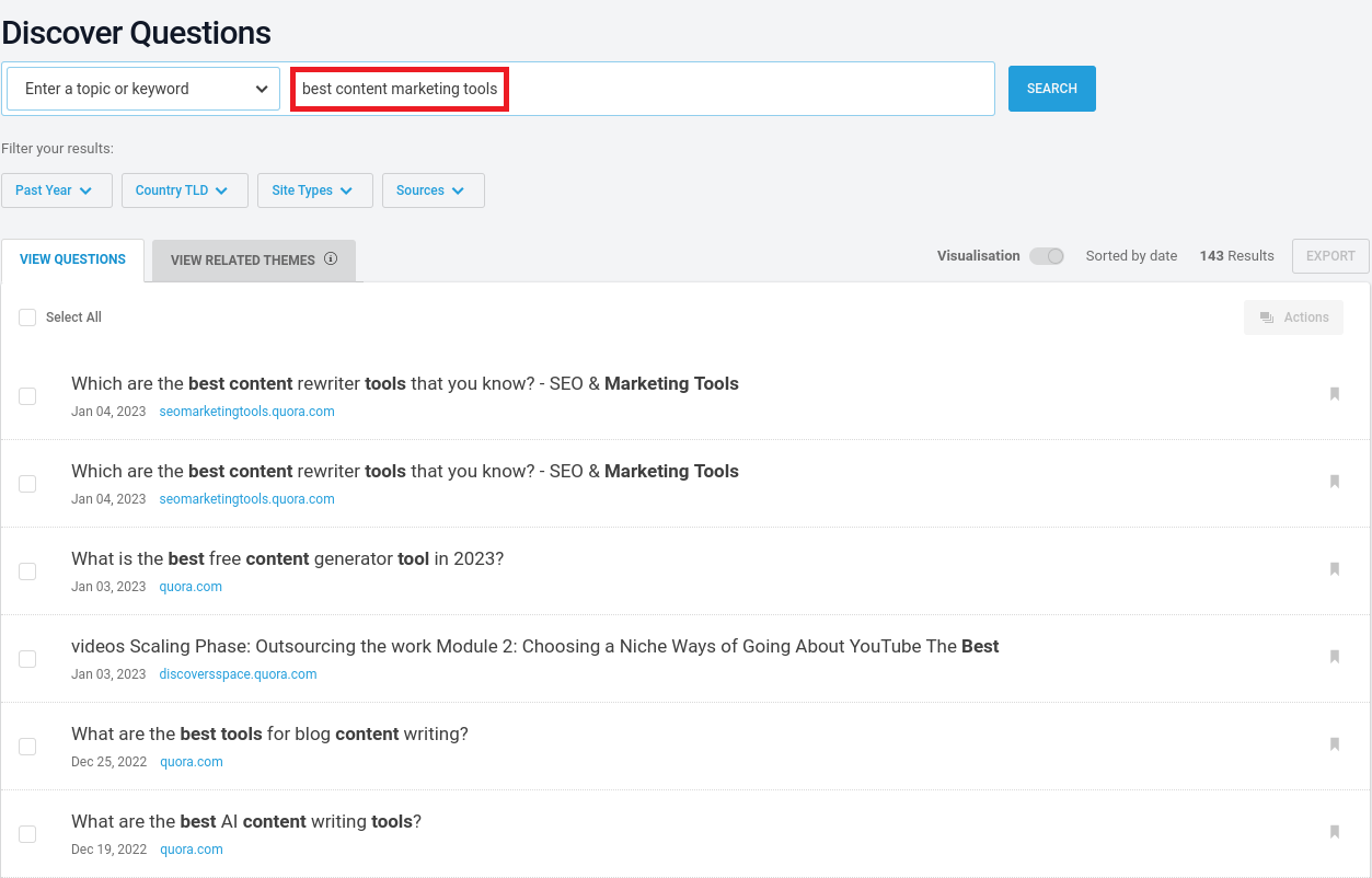 Esta ferramenta de descoberta de conteúdo dá à ferramenta de pesquisa de palavras-chave da Semrush uma boa corrida pelo seu dinheiro: pode ser inestimável para determinar quais assuntos merecem sua atenção, bem como reabastecer bem sua ideia quando ela se esgotar.