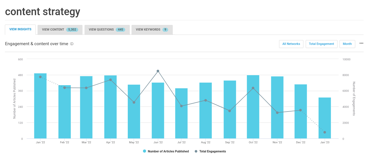 Com esta ferramenta, você pode visualizar uma série de insights sobre o conteúdo de tendências em torno de um tópico específico, aprender quais tipos de conteúdo e duração têm melhor desempenho para esse tópico e até mesmo descobrir o melhor horário e plataforma de mídia social para compartilhar seu conteúdo com seu público-alvo. público.