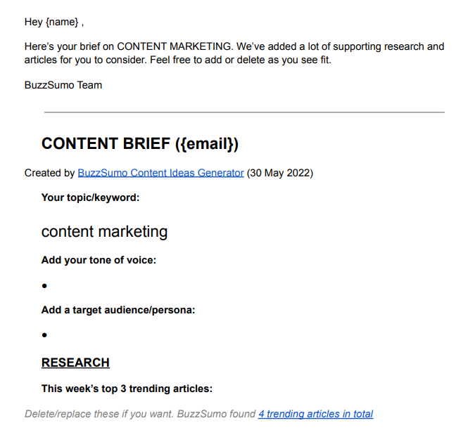 O recurso gera automaticamente um resumo do artigo que os gerentes de conteúdo podem distribuir aos seus redatores com sugestões de palavras-chave, perguntas a serem respondidas e os principais artigos concorrentes: