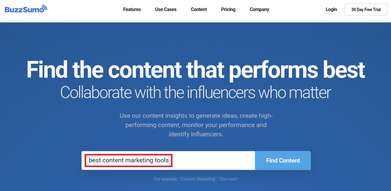 Em seguida, visite BuzzSumo.com e digite essa palavra-chave na barra de pesquisa e clique em Localizar conteúdo :