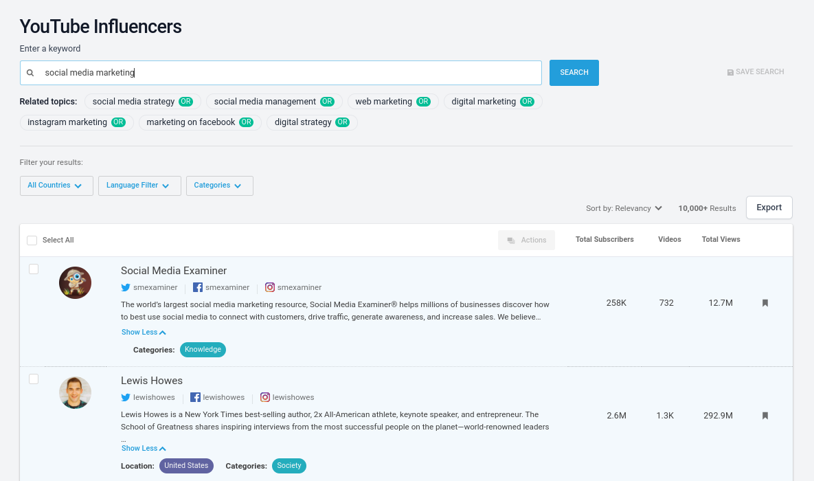 Se sua estratégia de marketing de influenciadores gira em torno do YouTube, você também pode usar esta ferramenta para identificar os principais YouTubers em seu setor e encontrar links para seus canais e outros perfis de mídia social: