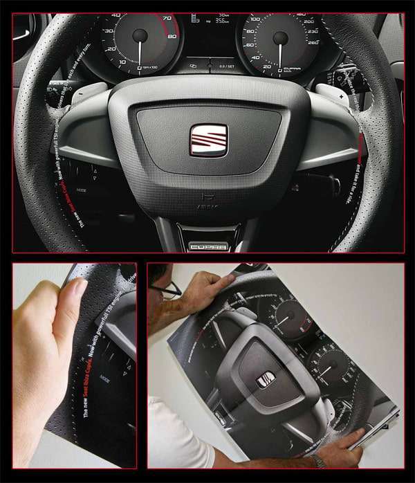 Ao segurar uma revista com as duas mãos, este anúncio de página dupla dá a você uma sensação literal de estar sentado ao volante do Seat Ibiza Cupra e olhando para o painel.