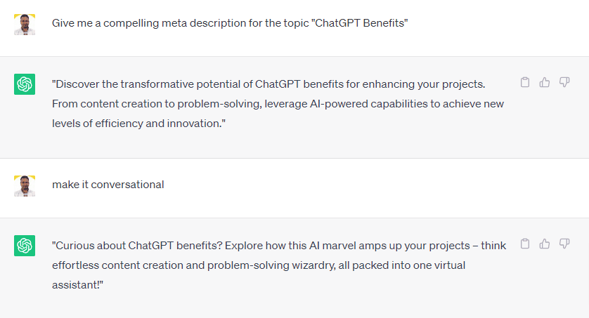ChatGPT criou uma meta descrição vaga (com tom profissional) no exemplo acima. Simplesmente adicionamos outro prompt (para torná-lo coloquial) e ele gerou instantaneamente uma descrição atraente.