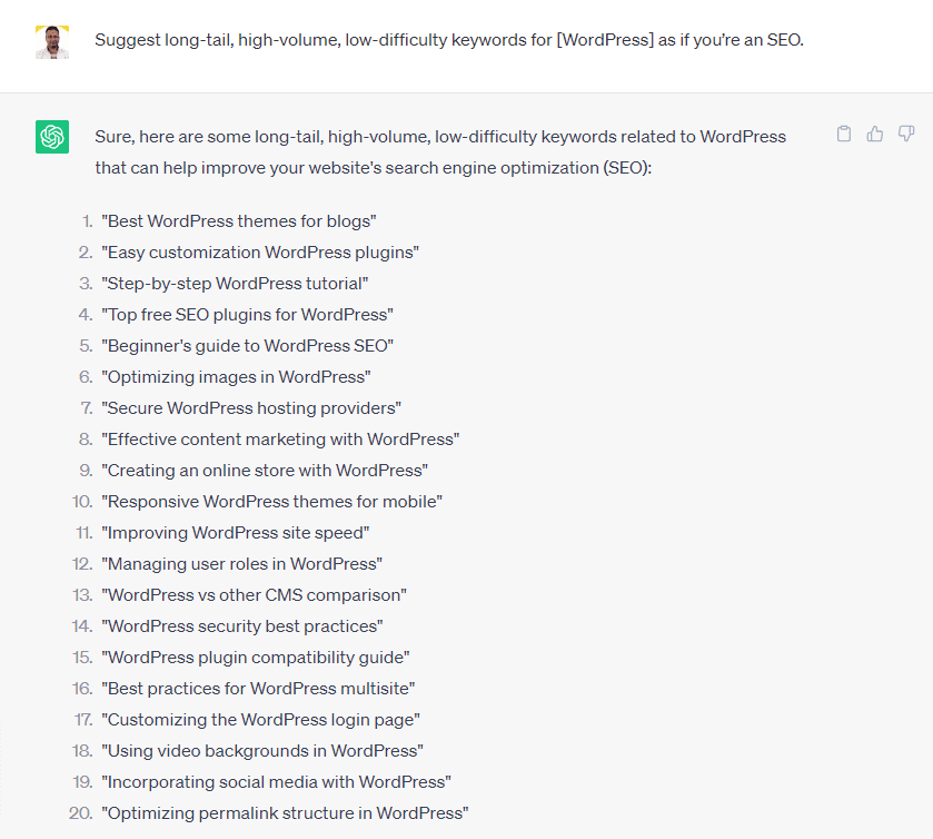 Aqui estão alguns exemplos de uso do ChatGPT para pesquisa de palavras-chave.