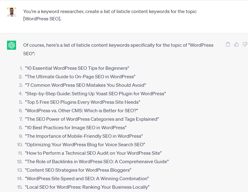 Vê isso? ChatGPT criou instantaneamente uma estratégia de SEO para nosso site. Da mesma forma, você pode usar o ChatGPT para quase QUALQUER finalidade geral de SEO.