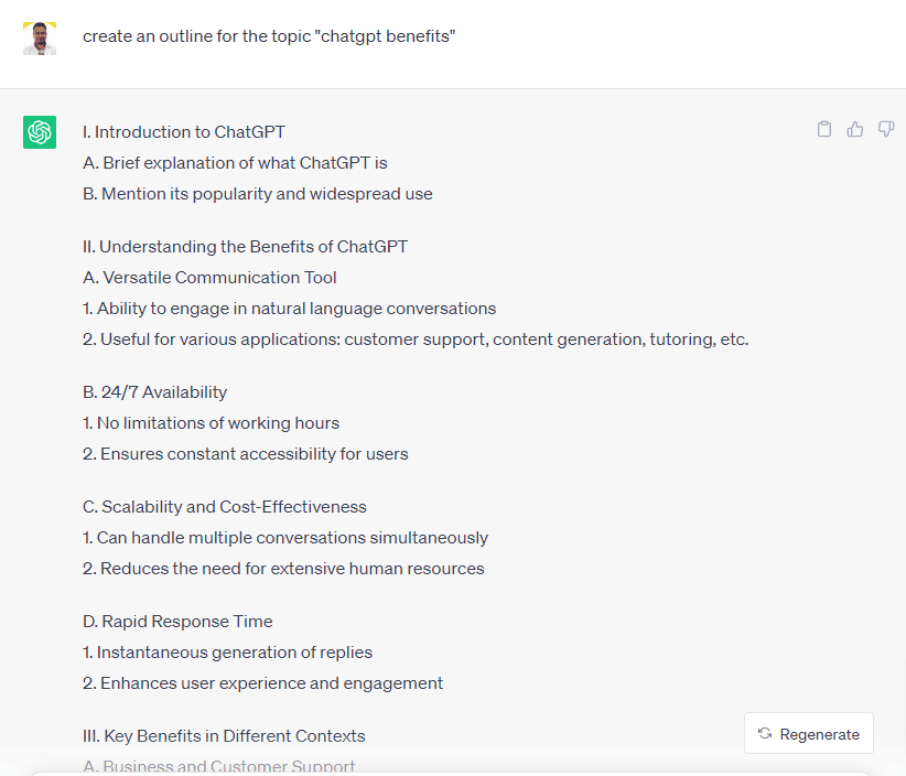 Você pode usar um prompt simples como “criar um esboço para o tópico [X]” para obter ideias sobre o que incluir em uma postagem de blog.