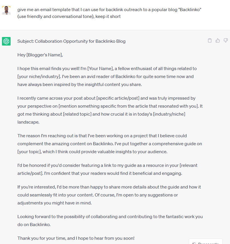 Por exemplo, podemos pedir ao ChatGPT para gerar um modelo de e-mail para fins de link building.
