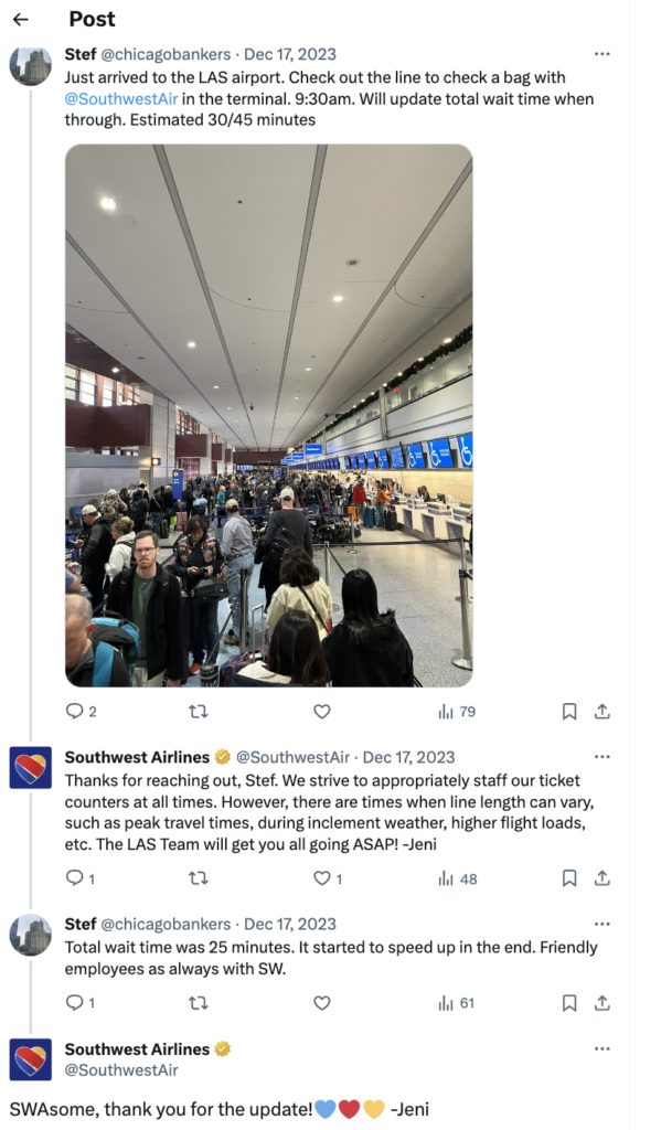 Por exemplo, a resposta rápida da Southwest Airlines a uma reclamação de um cliente sobre uma longa fila de despacho de bagagem garantiu ao cliente insatisfeito que ele estava comprometido em atendê-lo o mais rápido possível. No final, o cliente disse que a espera não foi muito longa e ainda elogiou os simpáticos funcionários da companhia aérea.
