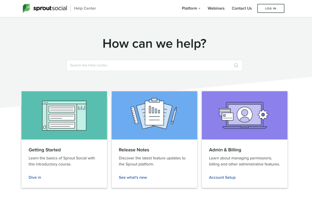 Por exemplo, a central de ajuda do Sprout Social inclui links para um curso introdutório para ajudar as pessoas a começarem a usar nossa plataforma, guias específicos de redes sociais e muito mais. A base de conhecimento também pode ser pesquisada para que os usuários possam encontrar respostas ainda mais rapidamente.