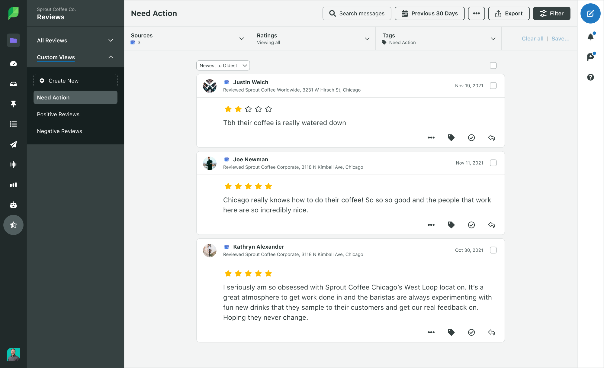 Os clientes muitas vezes recorrem a sites de avaliação para reclamar de uma empresa, mas monitorar manualmente todas as diferentes plataformas de avaliação é um desafio. O Sprout simplifica o gerenciamento de avaliações on-line reunindo avaliações do Facebook, Google Meu Negócio, TripAdvisor e outros sites de avaliações on-line em uma única plataforma. Este recurso permite responder com eficiência a reclamações, filtrar avaliações e atribuir tarefas a outros usuários.