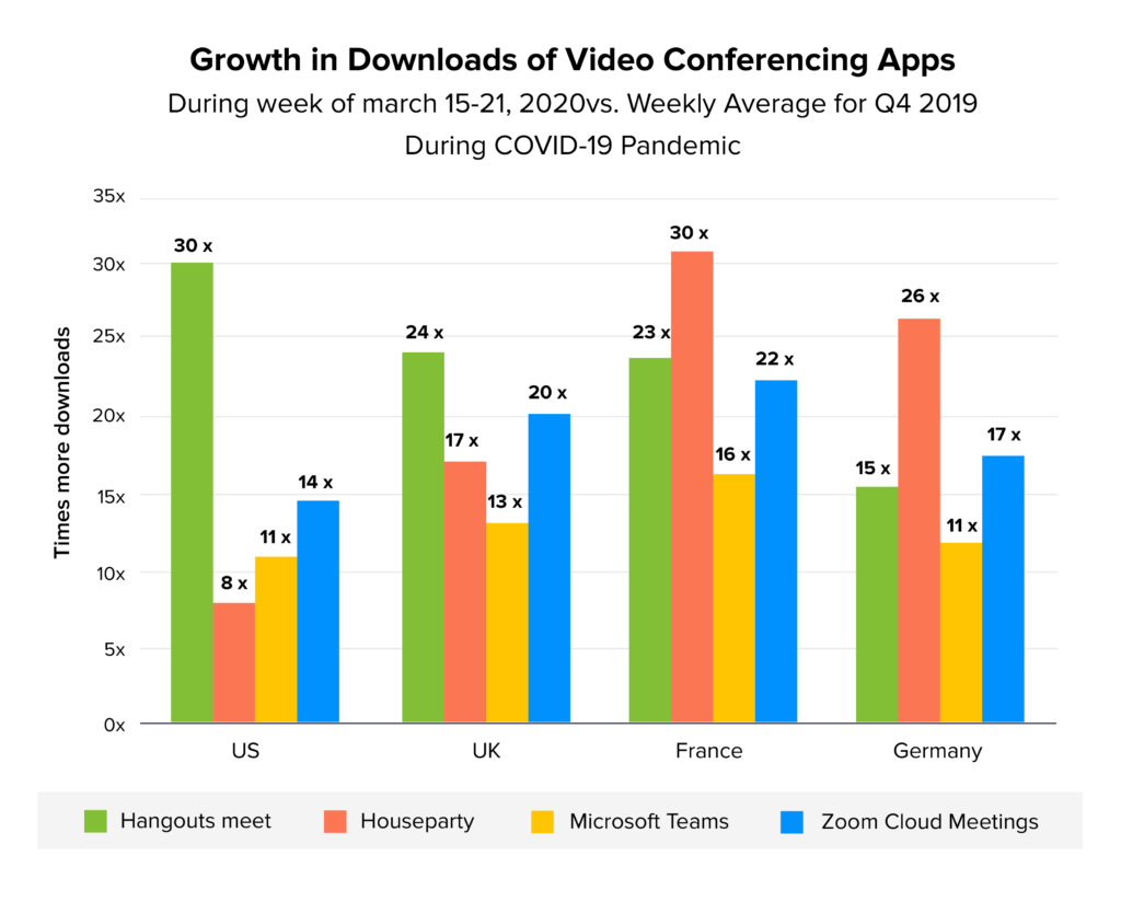 O resultado dessa demanda sem precedentes por aplicativos de videoconferência levou a um evento em que os aplicativos mais bem classificados na Play Store e na App Store são Skype, Zoom, Google Classroom, Google Hangouts, Telegram, Whatsapp e outros aplicativos de reunião virtual e conferência virtual .