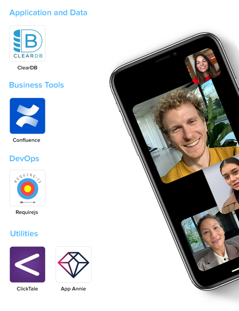 Para aplicativos e dados contamos com ClearDB, usamos o Confluence como ferramenta de negócios, RequireJS para DevOps e ClickTale, App Annie para utilitários.