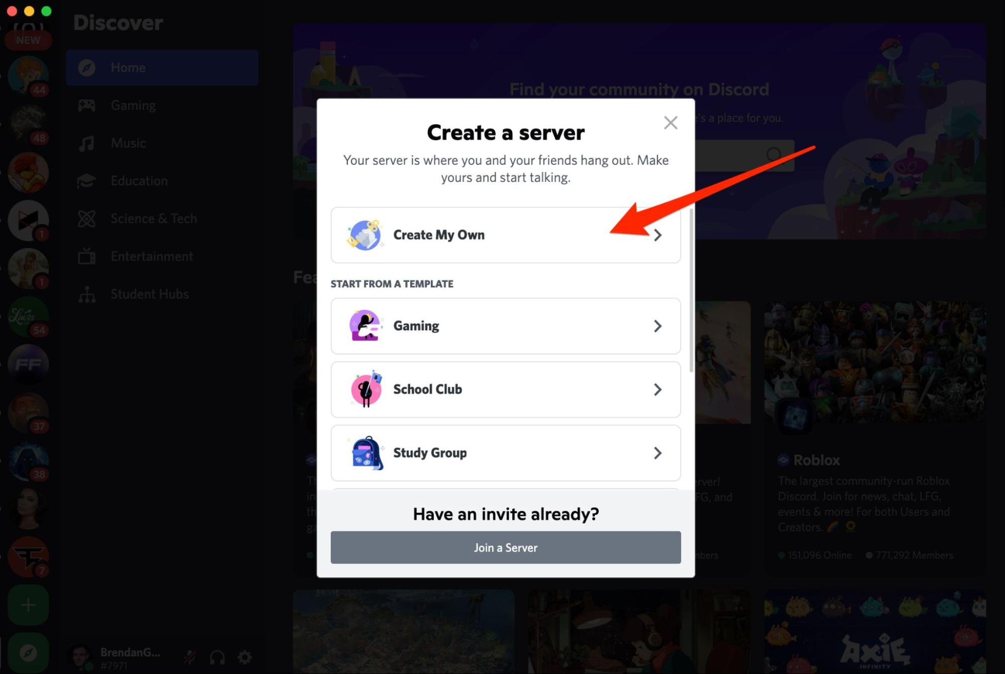 Para iniciar um novo servidor Discord, clique no sinal de mais abaixo dos ícones do servidor no lado esquerdo da tela.
