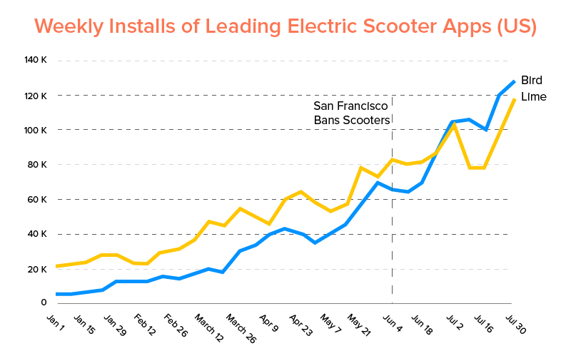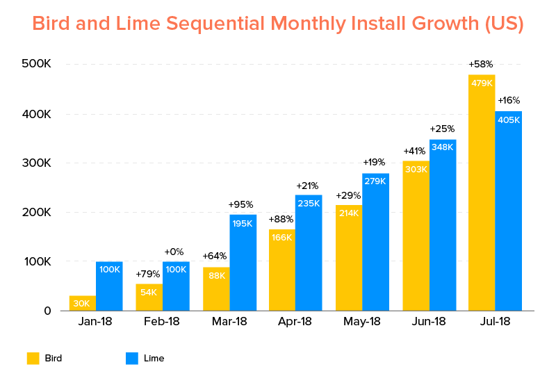 A contagem mensal de downloads dos aplicativos Bird e Lime aumentou 580% entre os meses de janeiro e julho de 2018 , destacando os benefícios dos aplicativos de escooter sob demanda que os usuários desfrutam. Os downloads chegaram a mais de 880.000 nos Estados Unidos — sete vezes mais do que nos primeiros 31 dias de 2018, conforme relatórios da Sensor tower .