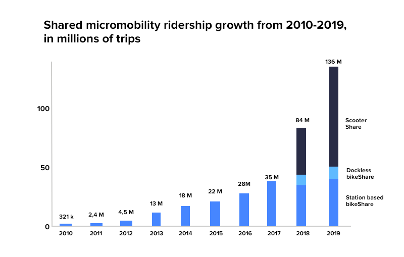 Em um relatório de 201 9 , o número de passeios feitos por americanos por meio de patinetes, bicicletas e sistemas tradicionais de compartilhamento de bicicletas foi de 136 milhões. Em 2018, o número de viagens foi de 84 milhões.