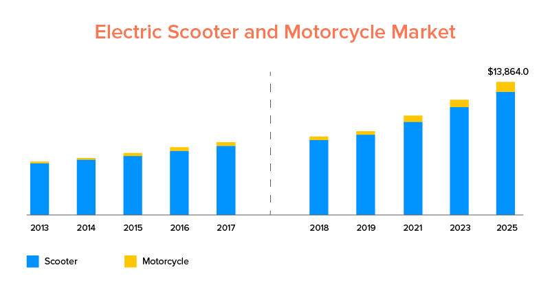 Devido à facilidade de transporte das eScooters, elas são muito apreciadas pelos usuários finais, fazendo com que o mercado de scooters e motocicletas elétricas atinja US$ 13.864,0 milhões até o ano de 2025.