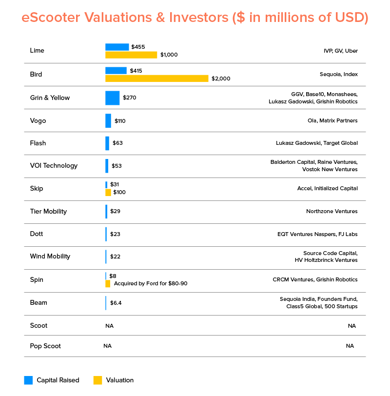 A Jump, que é uma marca bebê da Uber , foi adquirida por US$ 200 milhões para fortalecer a marca de micromobilidade e teria arrecadado um financiamento total de US$ 11,6 milhões. Sua receita anual estimada é de US $ 5 milhões, que deve crescer com a expansão da indústria de patinetes elétricos.