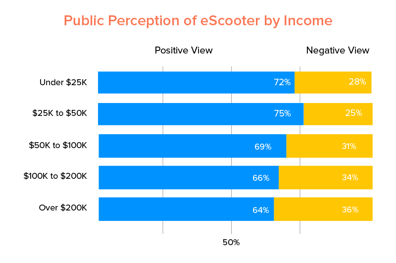 Em uma pesquisa realizada pela Populus , foi revelado que 70% dos entrevistados, em média, têm uma visão positiva das E-Scooters. Ao dissecar a percepção do consumidor por Cidades, Gêneros, Renda e Idade, obteremos uma perspectiva mais clara de onde existe a demografia da E-Scooter.
