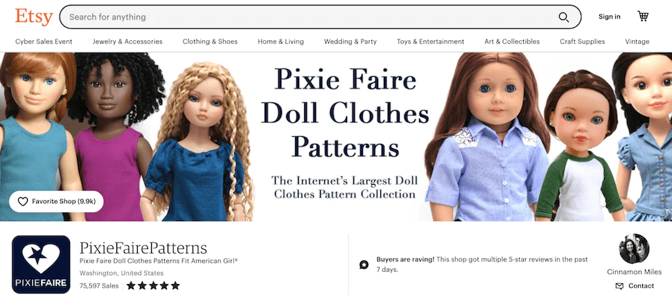 Shopify comerciante Pixie Faire vende downloads digitais de padrões para costurar roupas de bonecas para marcas populares como American Girl e Barbie. Ela complementa suas vendas na web com uma loja Etsy, onde os clientes também podem comprar os modelos e padrões da marca para download instantâneo. Mais de 9.000 pessoas favoritaram a loja.