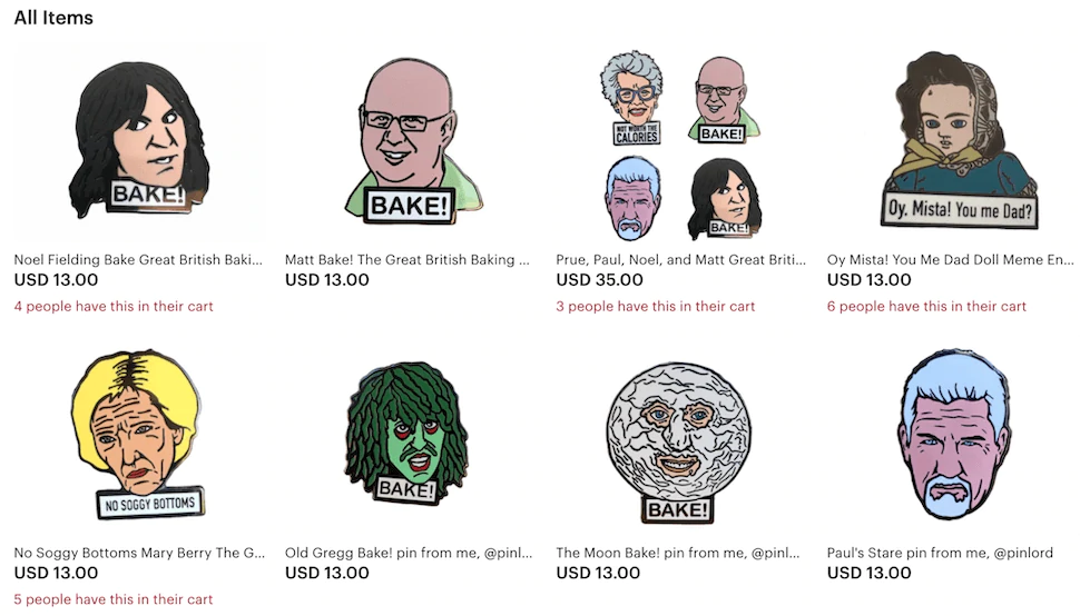 Pinlord vende pinos de esmalte no Etsy e Shopify, sob o nome de loja Etsy Enamelpinsforever. Os pins inspirados na cultura pop têm desenhos ilustrados com slogans abaixo. Eles compartilham um estilo de design distinto, embora cada um acene para um tema ou piada diferente.