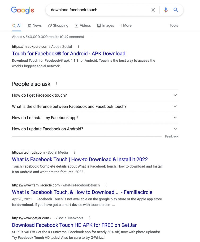 Em vez disso, você precisará obter um arquivo APK. Isso você pode obter pesquisando o termo “baixar o Facebook Touch” no campo de pesquisa do navegador da Web que você normalmente usa. No entanto, para fazer isso, primeiro você precisa alterar as configurações de autorização do seu dispositivo para permitir a instalação de aplicativos de remetentes desconhecidos.