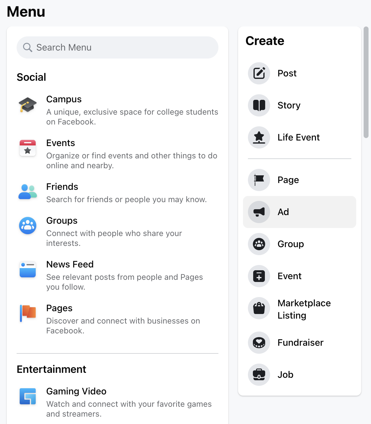 O tipo que você vê com mais frequência são os anúncios que aparecem diretamente no seu feed à medida que você rola a página. Os anúncios de feed do Facebook podem ser anúncios de imagem única, carrossel, coleção ou vídeo.