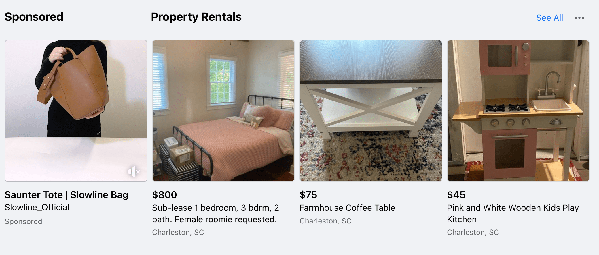 À medida que os usuários percorrem o Facebook Marketplace, as listagens patrocinadas aparecem com listagens orgânicas. Esse tipo de anúncio é uma ótima maneira de mostrar seu produto quando alguém já está interessado em comprar.