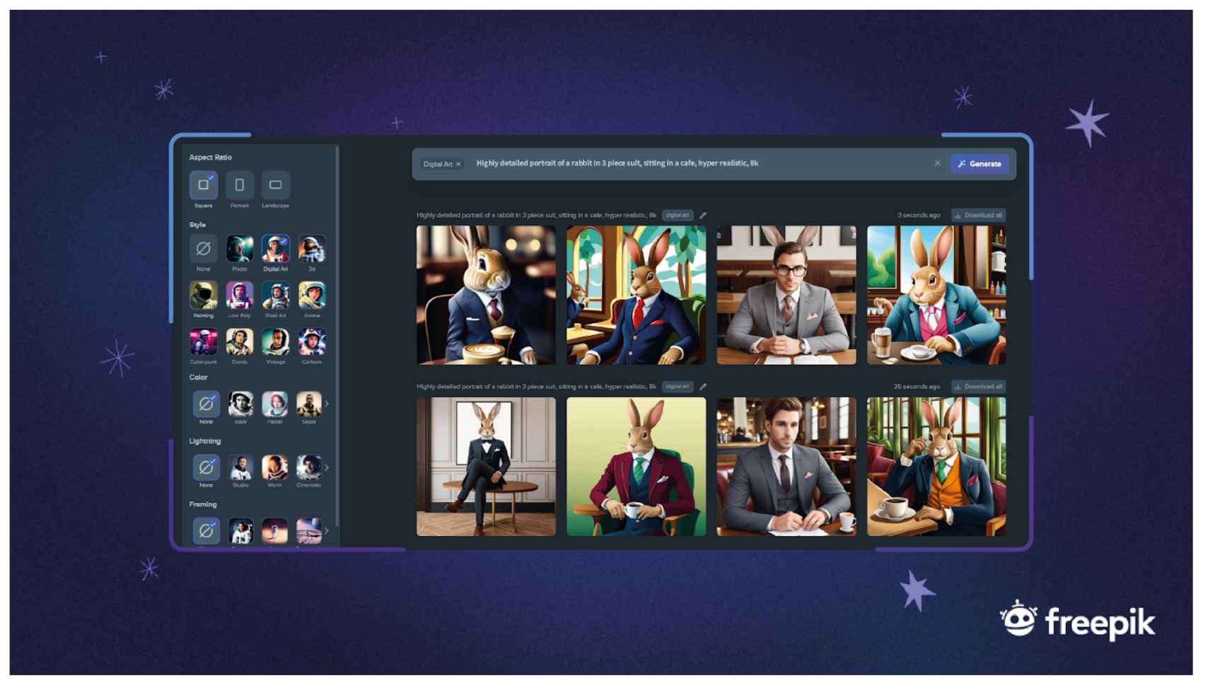 A tecnologia de IA de texto para imagem do Freepik é uma virada de jogo. Ele permite que os usuários transformem avisos textuais em imagens vívidas, rompendo as fronteiras do design tradicional.