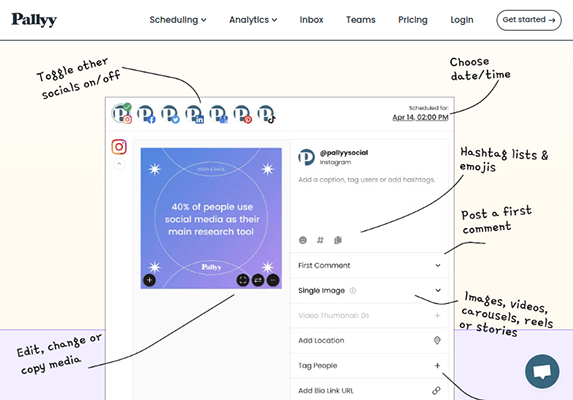 Você também pode usar uma ferramenta de gerenciamento de mídia social como Pallyy para agendar o conteúdo do Instagram com antecedência e gerenciar comentários. Ele vem com sua própria ferramenta link-in-bio.