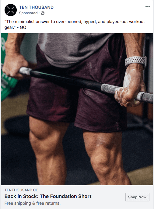 Neste exemplo, Ten Thousand me envia direto para a página da loja para seus shorts. Infelizmente para eles, sou um comprador fiel dos shorts do Savage Ultimate (sério, essas coisas parecem ar), mas tenho certeza de que pareço uma boa combinação com o algoritmo do Facebook.