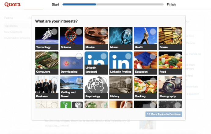 Começar com o Quora é fácil: a plataforma orienta você pelo processo e imediatamente solicita que você selecione suas áreas de interesse.