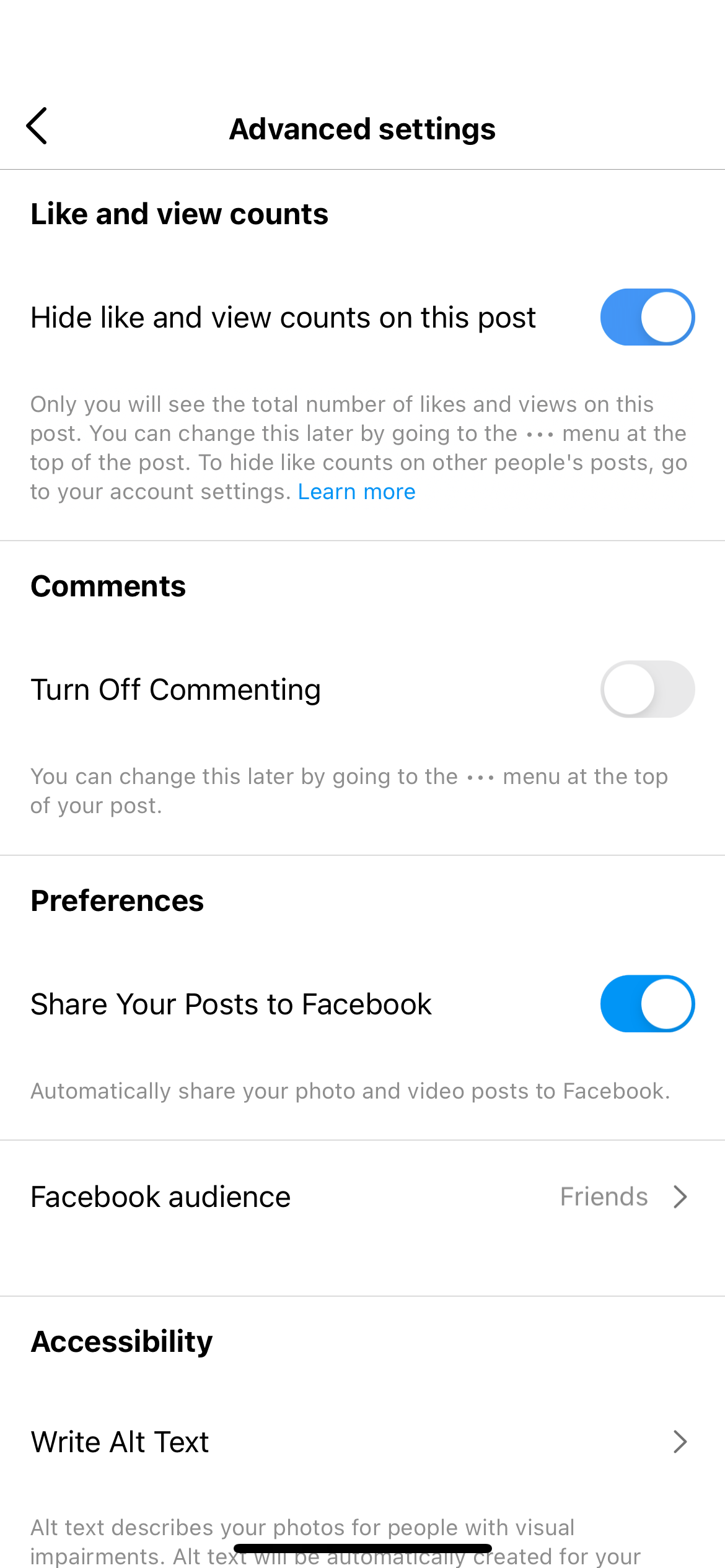 Etapa 3. Em Configurações avançadas , você também pode fazer ainda mais alterações antes de publicar, como adicionar texto alternativo à sua postagem do Instagram para quem usa leitores de tela ou até mesmo desativar os comentários.