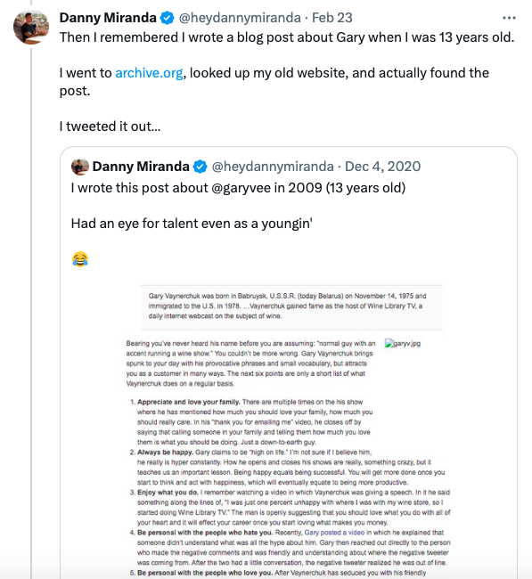 Há também o ROI da sorte. Essencialmente, se você jogar o jogo por tempo suficiente, algumas coisas darão certo. Por exemplo, ele contratou Gary Vaynerchuck porque escreveu uma postagem no blog sobre ele em 2009 e depois tweetou sobre isso novamente em 2020: