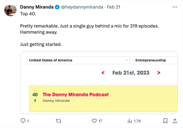 Por exemplo, ele notou que alguém que o segue tweetou que estava iniciando um podcast. Então ele estendeu a mão e se ofereceu para ajudar se aquela pessoa precisasse de alguma coisa. Isto levou a uma conversa telefônica de 45 minutos, onde Danny forneceu algumas orientações iniciais.