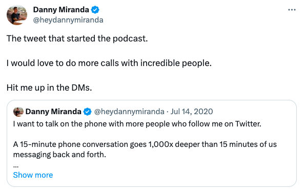 Na verdade, seu podcast começou porque ele postou um tweet convidando seus seguidores a fazer ligações individuais com ele. Ele gostava dessas conversas, então fazia sentido apenas gravá-las e transformar o conteúdo em um podcast.