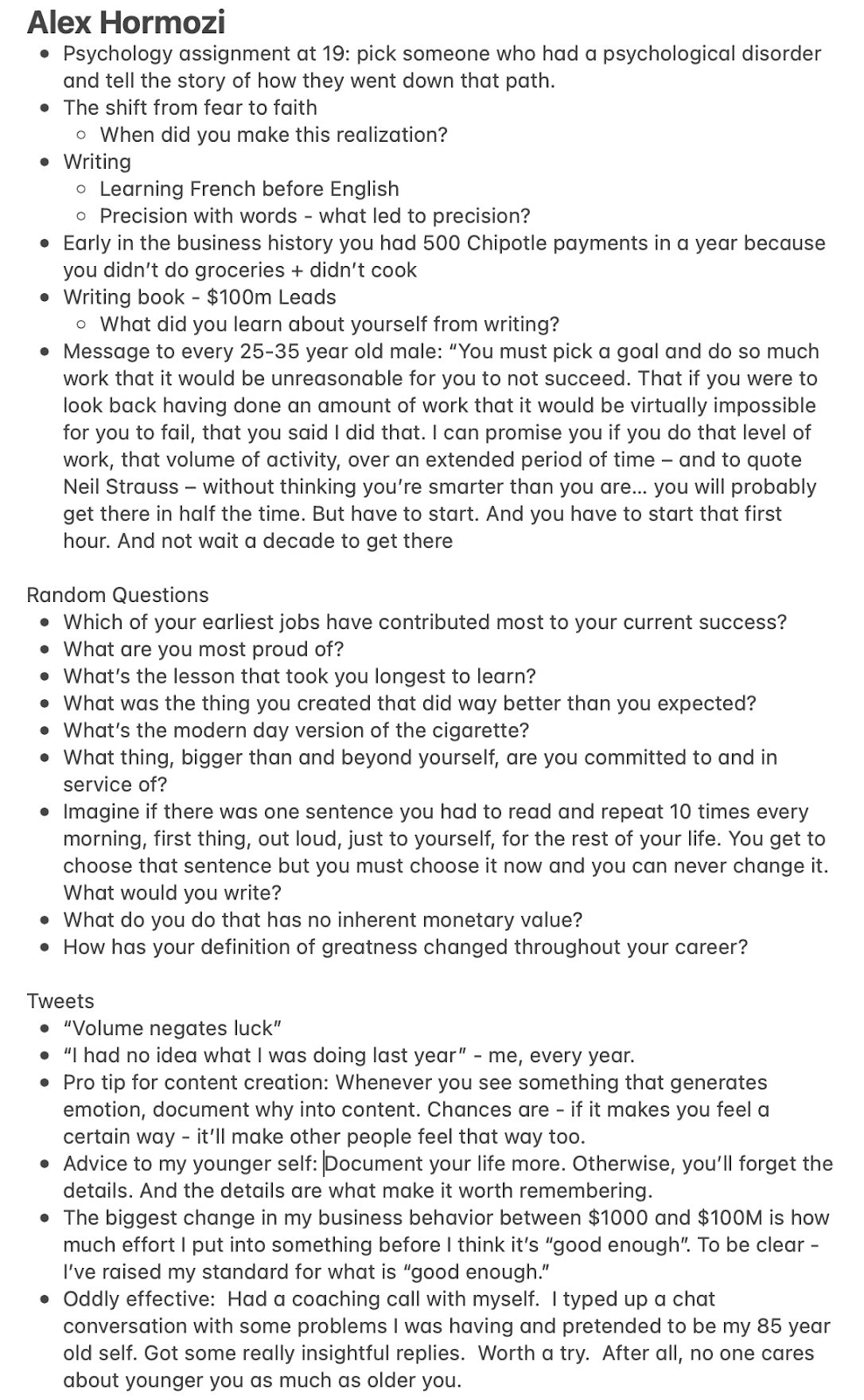 Na verdade, aqui está o documento exato que ele usou ao se preparar para a entrevista com Alex Hormozi: