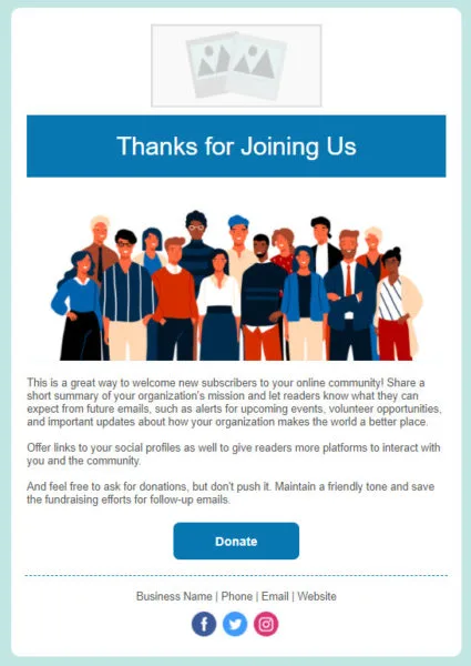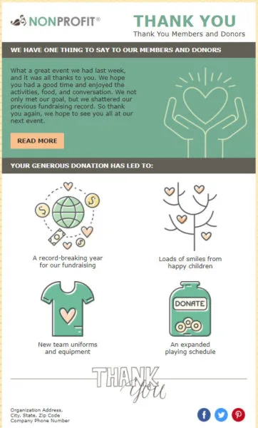 Veja um exemplo de e-mail de agradecimento enviado por uma organização sem fins lucrativos a novos assinantes: