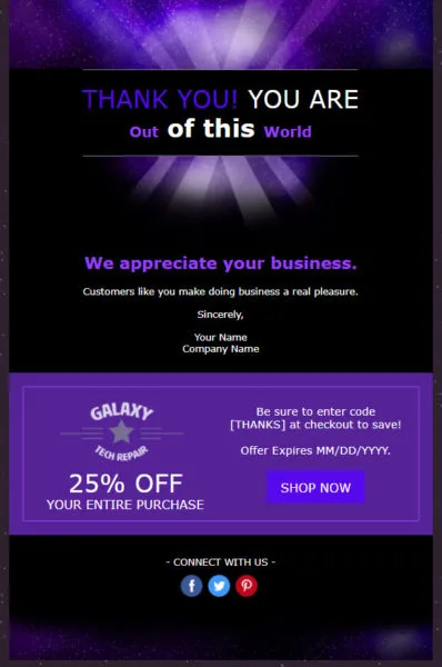 Um simples e-mail que agradece aos clientes por seu apoio, associação contínua e contribuição para o seu sucesso fará com que eles se sintam parte do seu negócio.