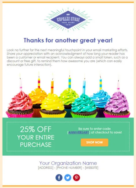 Um marco de negócios é outra oportunidade de enviar um e-mail de agradecimento. Pode ser seu primeiro, quinto ou décimo aniversário, ou você abriu uma nova loja, recebeu um prêmio ou foi reconhecido pela comunidade local.