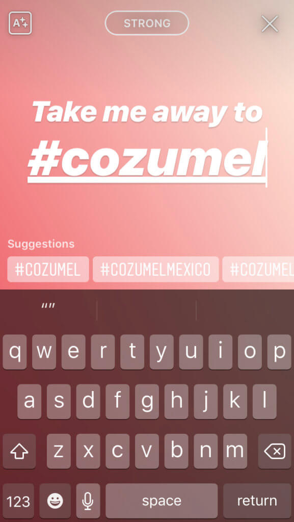 Lembre-se de que você só pode usar uma hashtag na opção Sticker, mas pode incluir hashtags (e menções) na opção de texto! Aqui está o que parece:
