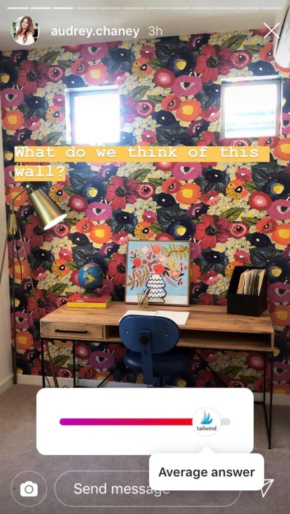 O usuário @audrey.chaney usa a barra de classificação para perguntar aos seguidores o que eles acham desse mural. Agora, se Audrey fosse uma designer ou fornecedora de papel de parede, ela poderia apresentar um produto ou serviço! Como corretora de imóveis, ela também poderia entrar em uma listagem se esta casa estivesse à venda!