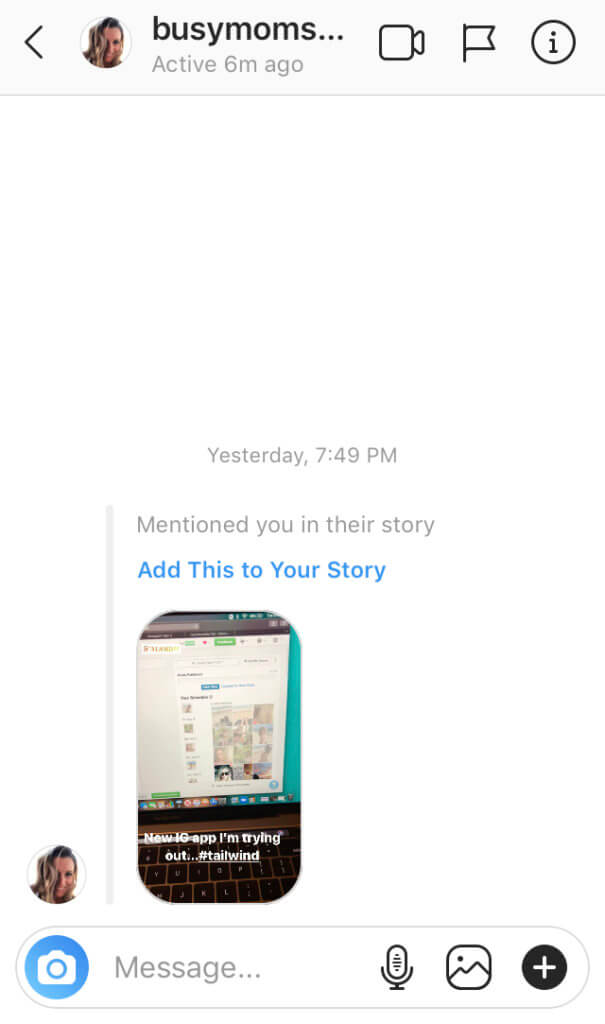 Ao republicar este conteúdo, colocamos a História deste usuário na frente de nosso próprio público. Então, @busymomsmakingbank obteria visualizações, engajamentos e talvez até cliques do nosso público e do nosso!