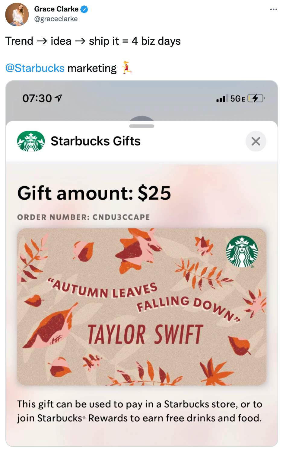 A Starbucks, por exemplo, vende cartões-presente o ano todo. Mas o varejista mantém um ouvido atento e cria designs de cartões-presente personalizados com base em tópicos de tendências. A letra da nova música de Taylor Swift apareceu em um cartão-presente da Starbucks apenas quatro dias após o lançamento.